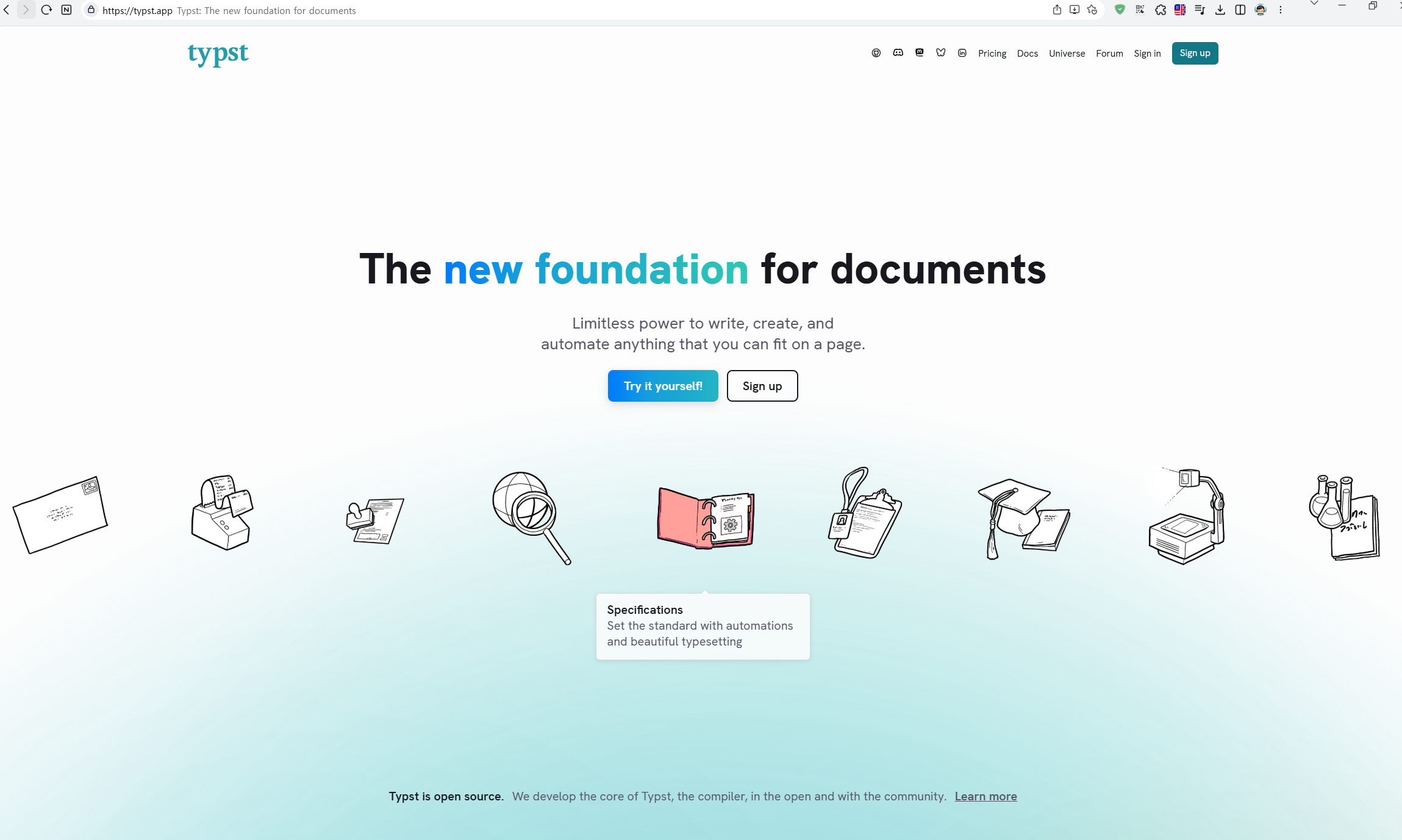 Typst is the new foundation for documents. Sign up now and experience limitless power to write, create, and automate anything that you can fit on a page.